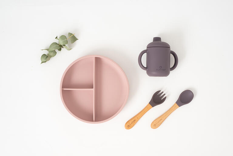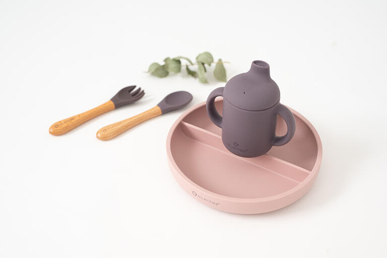 Silicona de alta calidad de grado alimenticio aprobada por LFGB. Cubiertos con formas redondeadas y suaves para evitar dañar la encía del niño.