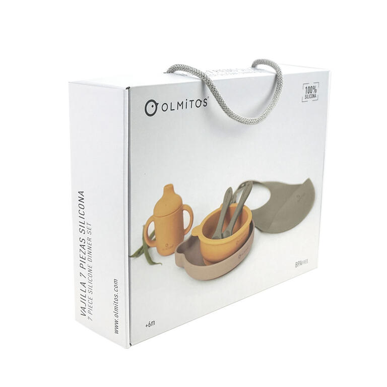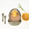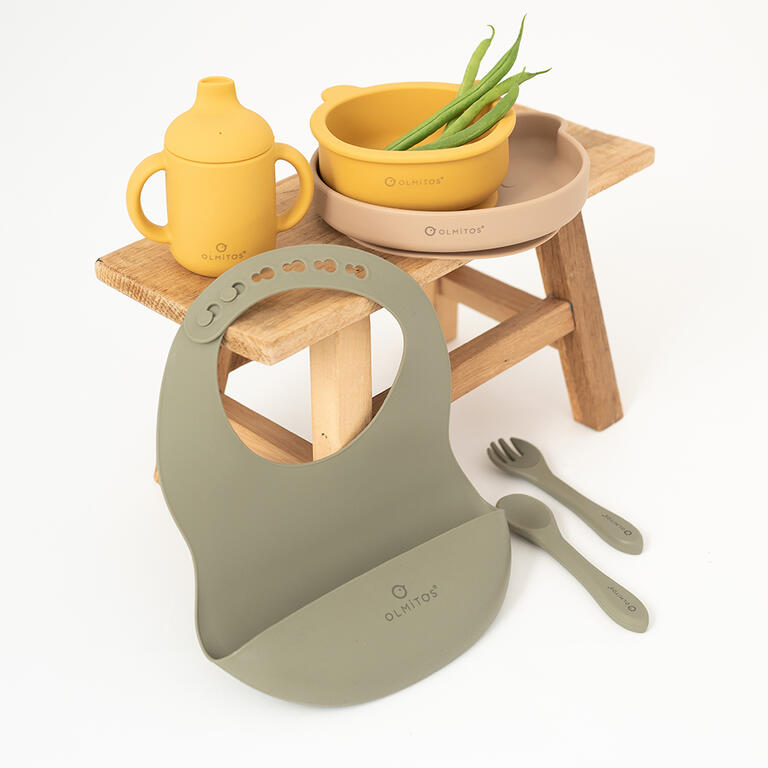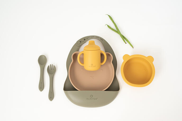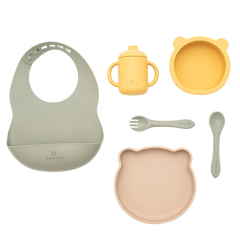 Contiene: Babero, plato, bol, cuchara, tenedor y vaso con boquilla. Silicona de alta calidad de grado alimenticio aprobada por LFGB.