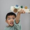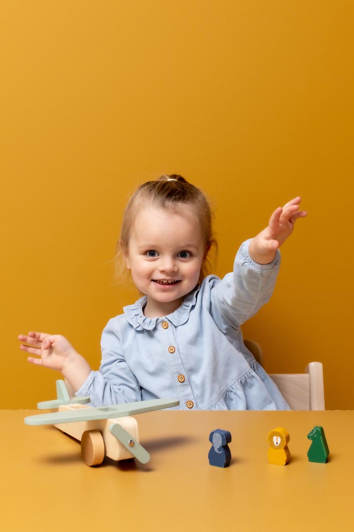 ¡Ven a volar con nuestros amigos animales! El Sr. Cocodrilo está listo para despegar.Viaja por el mundo junto con sus dos pasajeros. Cada peón de animal cabe en cada asiento. Una rueda en la parte delantera y una rueda oculta en la parte trasera garantizan que todos los animales tengan un aterrizaje seguro. ¡Haz girar la hélice y el avión está listo para despegar! El avión está hecho de madera 100% certificada FSC®. Todas las pinturas de este producto son a base de agua, seguras para los niños y no tóxicas.