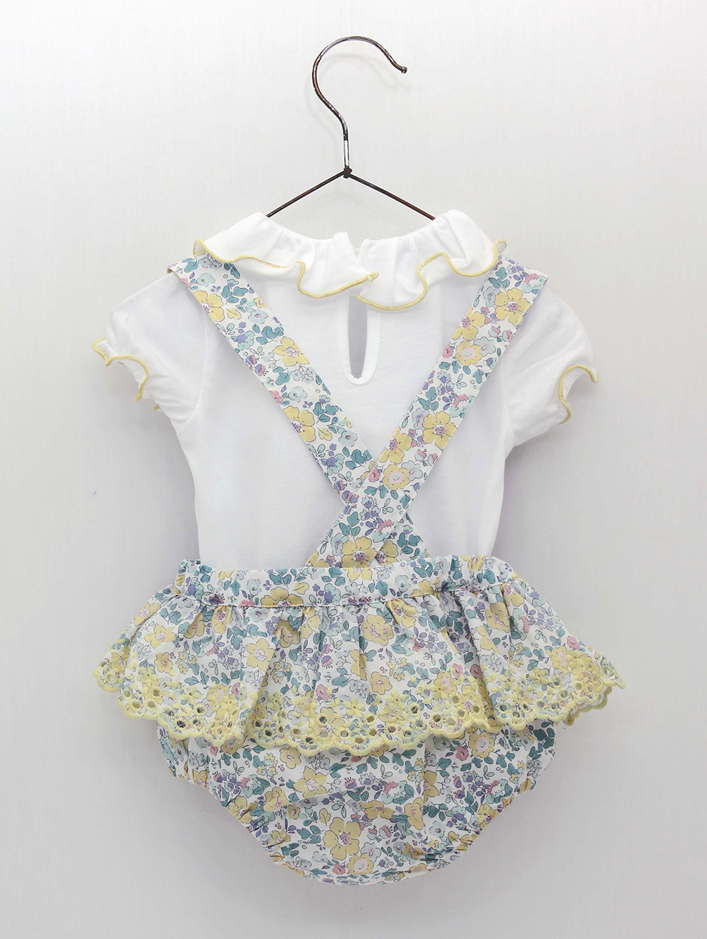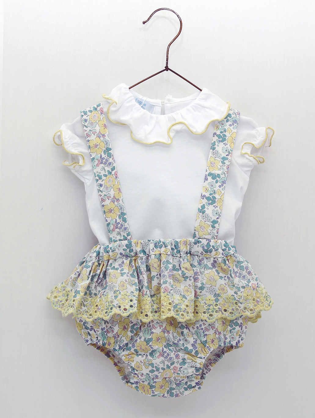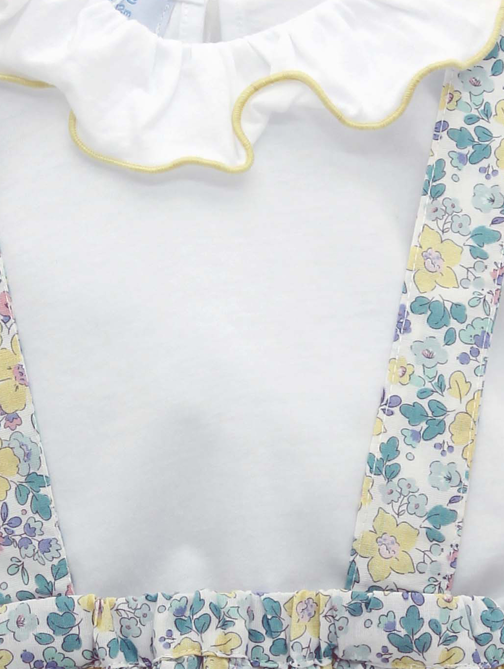 Conjunto formado por una camiseta de manga corta blanca de algodón, con rulillo flúor en cuello y mangas, pantalón braguita de tirantes en estampado liberty con volante con tira bordada fluor. Colección Juliette. Completa el look con la capota en el mismo estampado liberty referencia 2415934. Diseñado y confeccionado en España