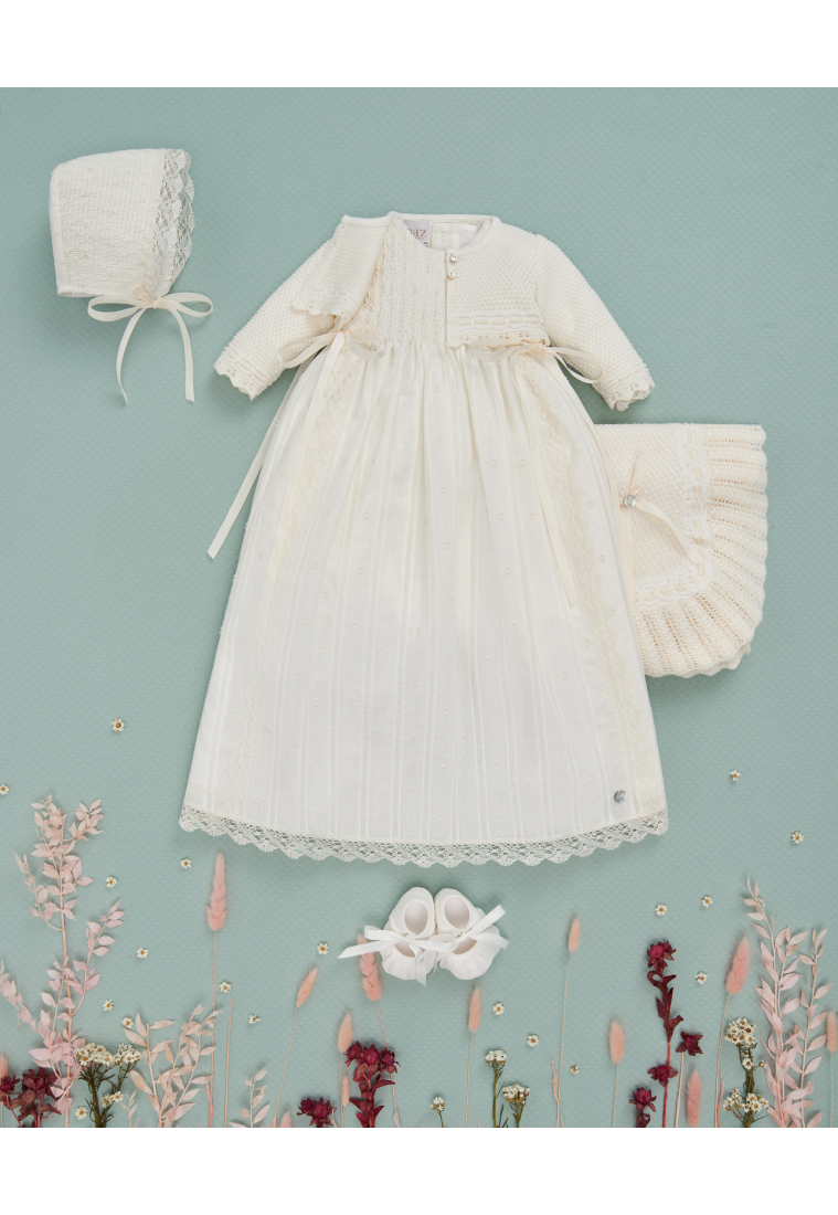 Faldón para ceremonia, bautizo o eventos especiales para bebé. De estilo clásico, en manga larga con remate de puntillas. Tejido organza con bodoques bordados y lazadas en ambos lados de la cintura. Nido de abeja en pechera y puntillas. Cuello redondo y cierre trasero con botones de nácar.