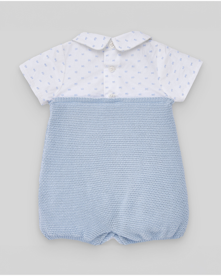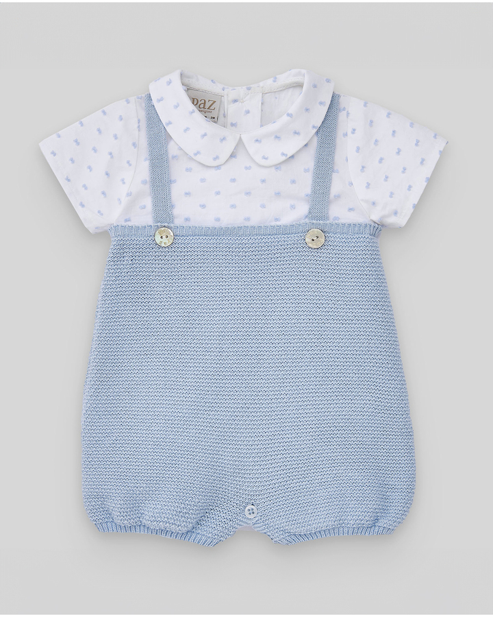 Pelele para bebé niño confeccionado en punto y tela. La parte inferior presenta un tejido de punto con encantadores tirantes. Destaca con botones decorativos de nácar en la parte delantera. La parte superior adopta un estilo de camisa con tejido plumeti. El cierre en la entrepierna facilita el cambio de pañal, mientras que la botonadura trasera completa el diseño con elegancia.