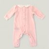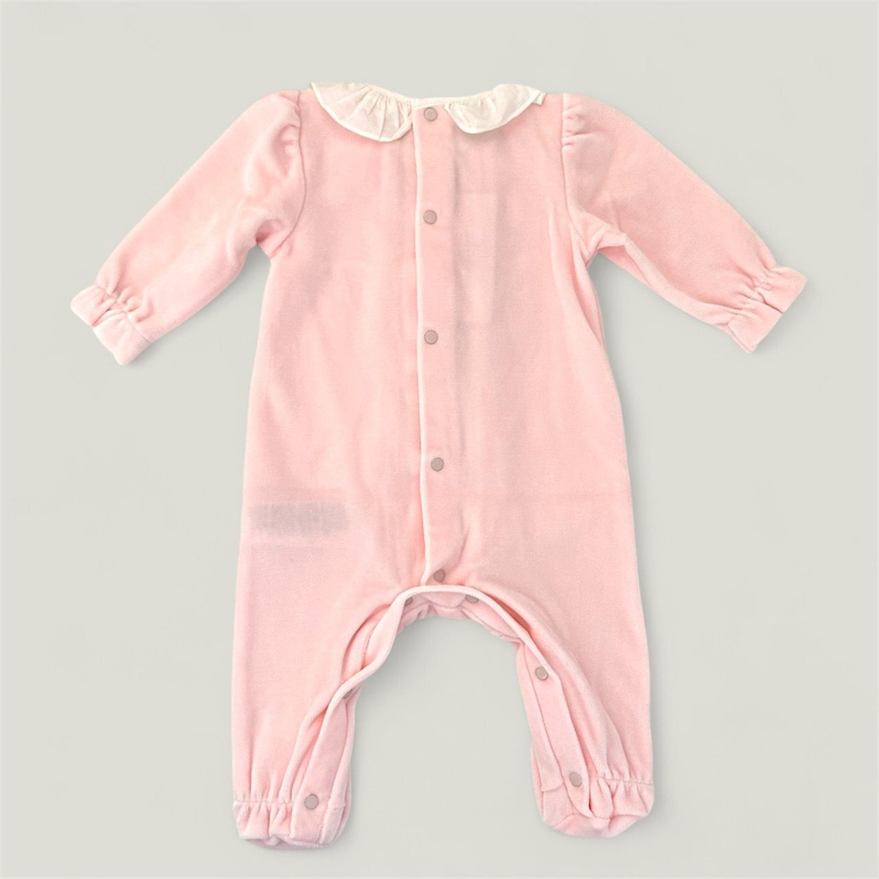 Pelele tundosado de cuello bebé con detalle de bordado. Abertura a través de botones a tono en espalda y piernas.