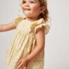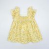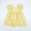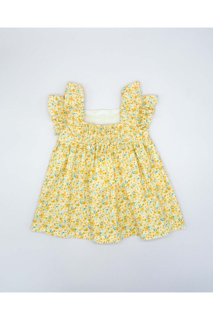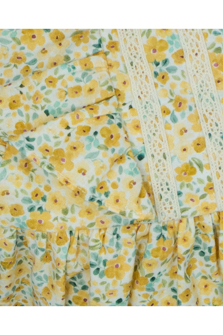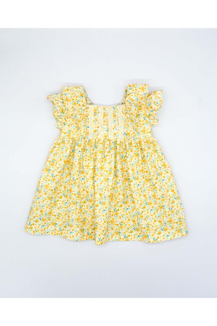 Vestido de flores amarillo, 100% algodón. Parte delantera superior con pieza central y puntilla, volantes. Espalda superior fruncida y con volantes. Mangas con volantes. Falda fruncida.