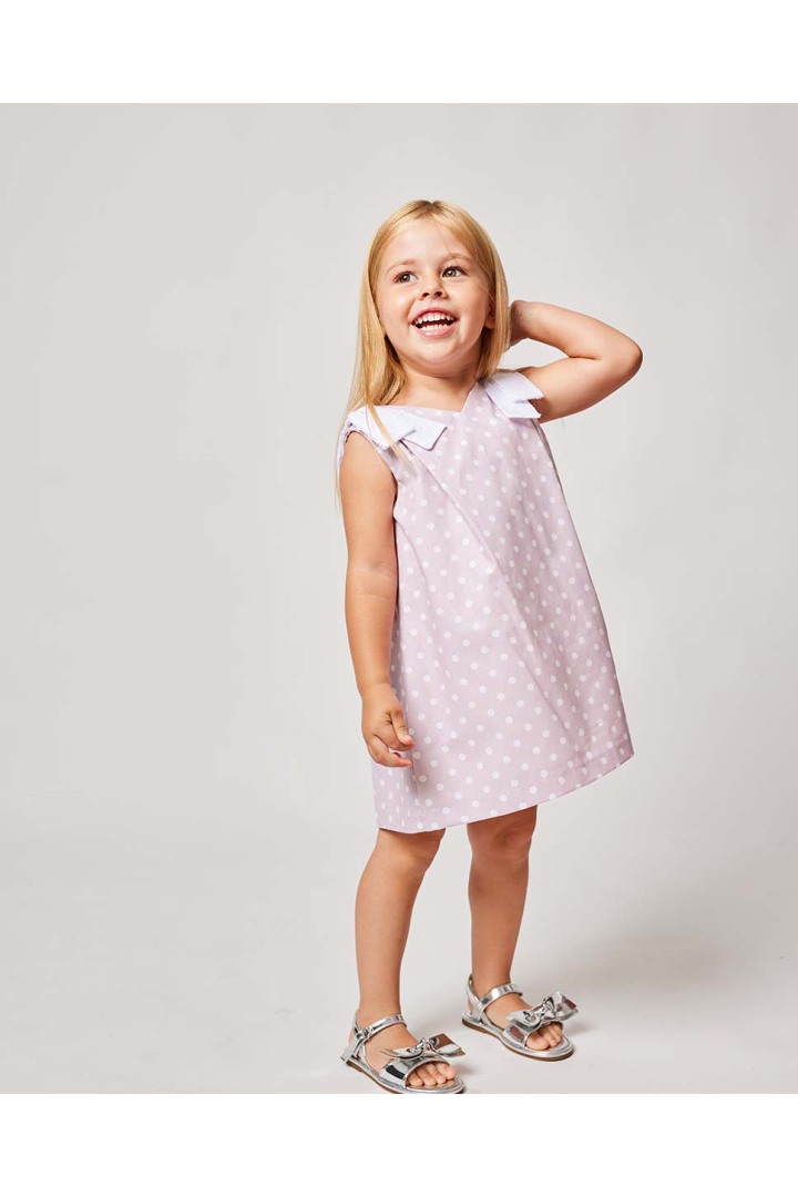 Vestido midi rosa con lunares blancos en algodón 100%. Escote en pico, sin mangas y lazos en blanco en el hombro. La espalda con goma para mayor ajuste.