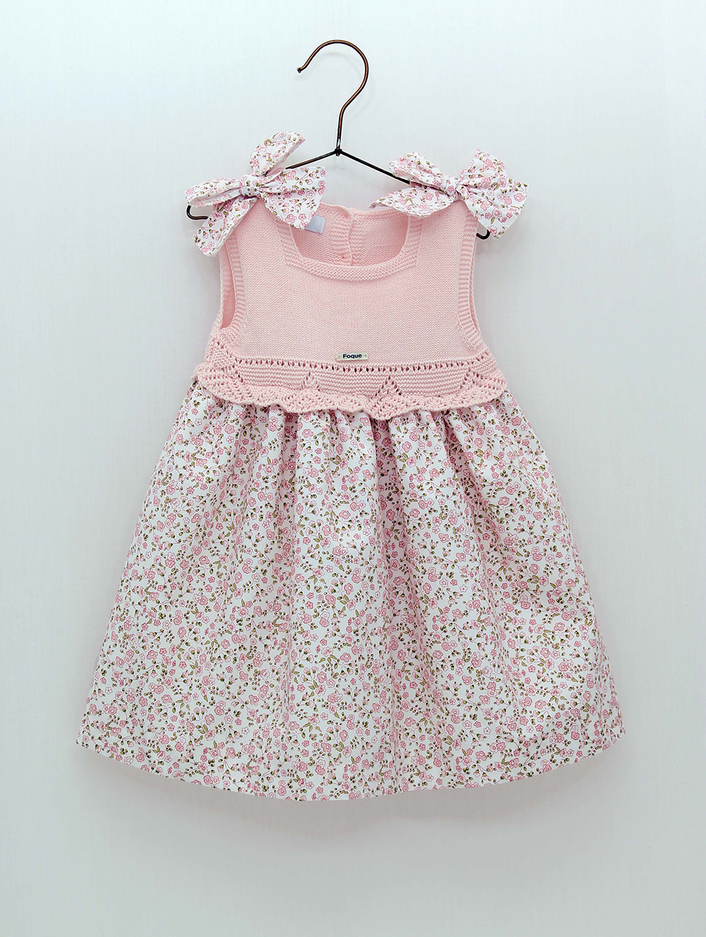 Vestido para bebé niña tipo faldón con cuerpo sin mangas de punto liso color rosa, con detalles calados, cuello caja y lazadas en hombros, falda tejido estampado liberty tonos rosas. Colección Ada.
