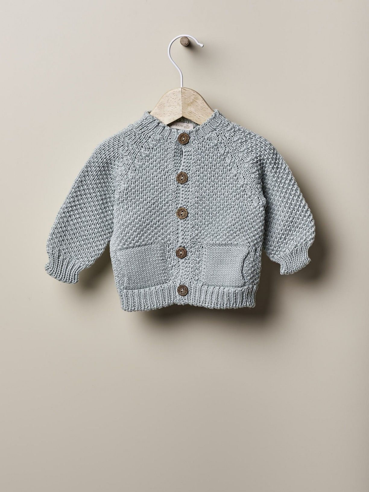 Cárdigan de manga larga tejido en algodón suave y transpirable, ideal para bebés niños y niñas, hasta 4 años. Cárdigan WELLNESS con dos bolsillos, cierre en la parte delantera con botones de coco. Confeccionada con la tecnología Wholegarment, esta prenda no tiene costuras para la máxima comodidad de tu bebé