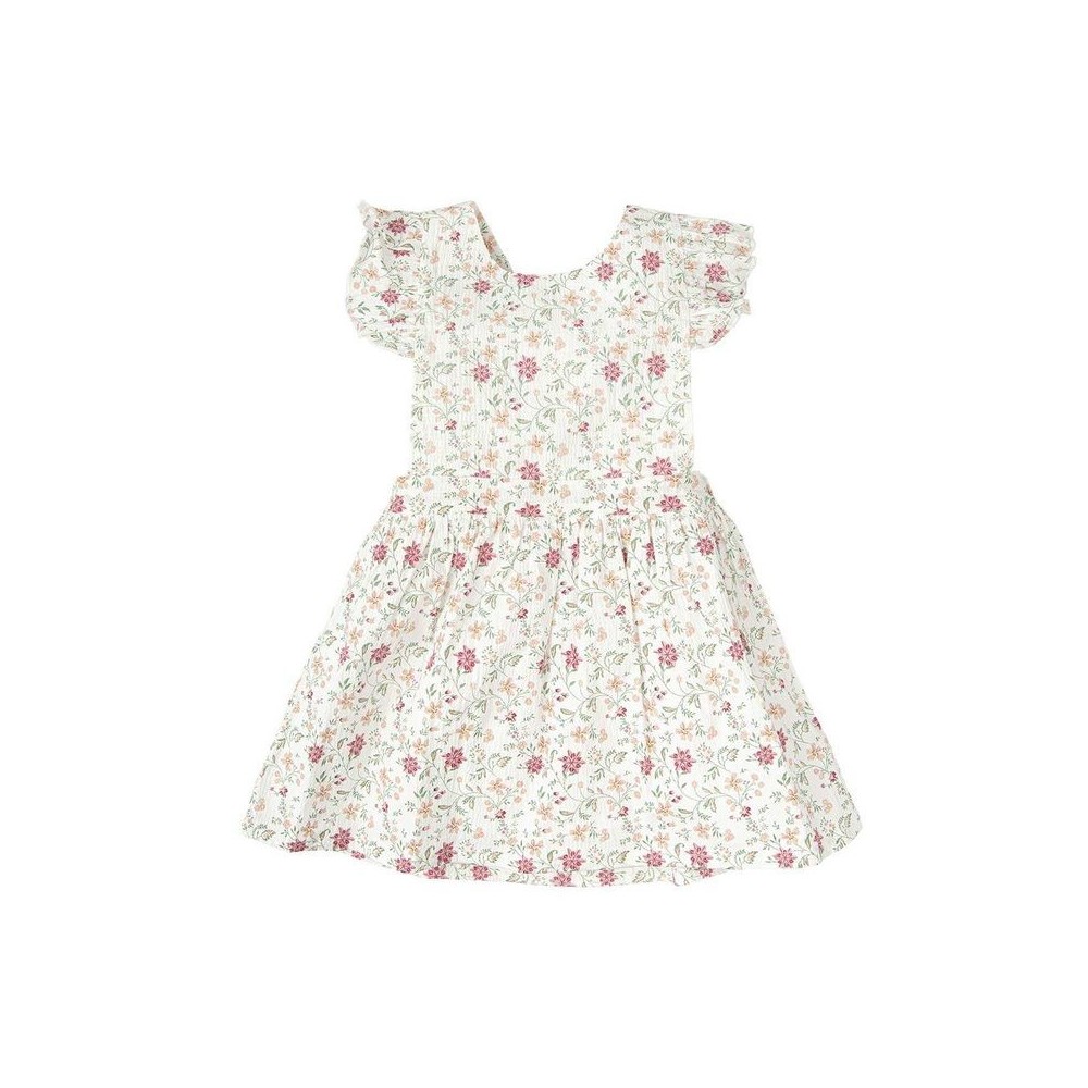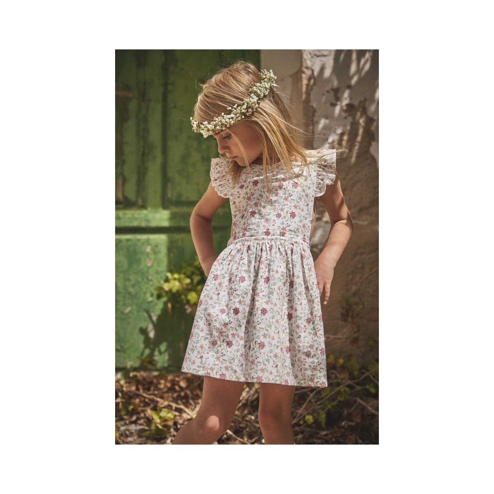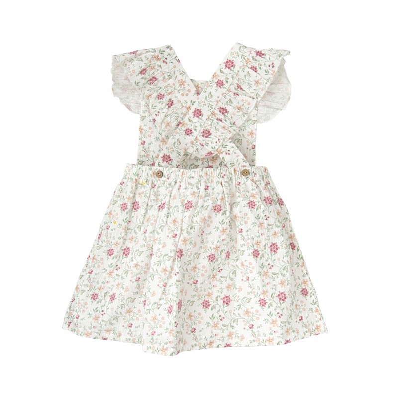 Este dulce vestido para bebé destaca por su encantador estampado floral en tonos rosa y naranja sobre un fondo crema, ideal para crear un look fresco y primaveral. Confeccionado en suave algodón, su diseño incluye mangas con volantes y una falda con vuelo que aporta un toque romántico y elegante.