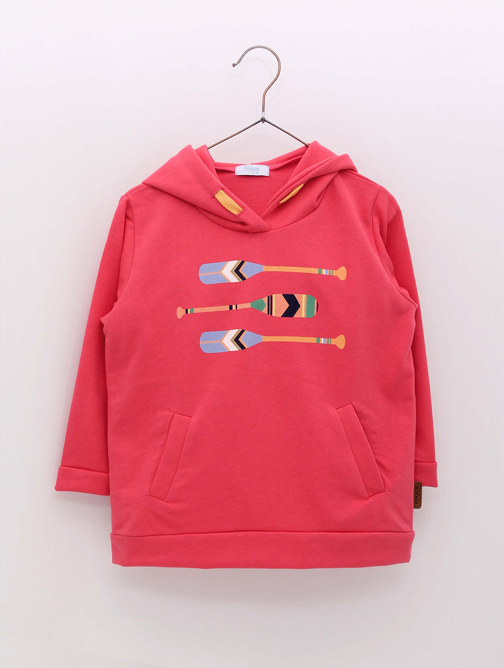 Sudadera con capucha niño confeccionada en tejido 100% algodón con bolsillos y dibujo exclusivo Foque remos de madera. Colección Flora. Diseña en España