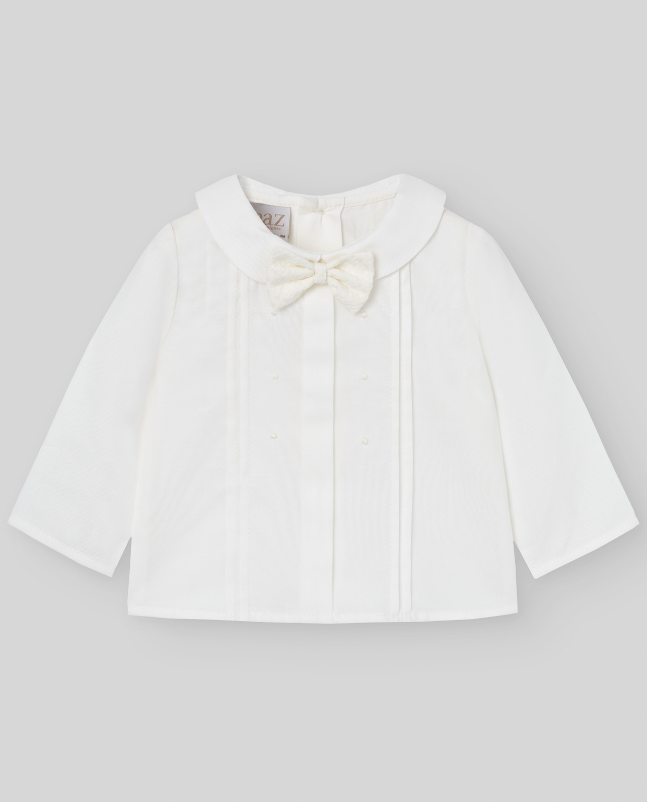 Blusa de manga larga para niño con tapeta y detalle de bodoques bordados. Incluye una pajarita decorativa y cuello bebé. Cierre trasero con botones del mismo tono.