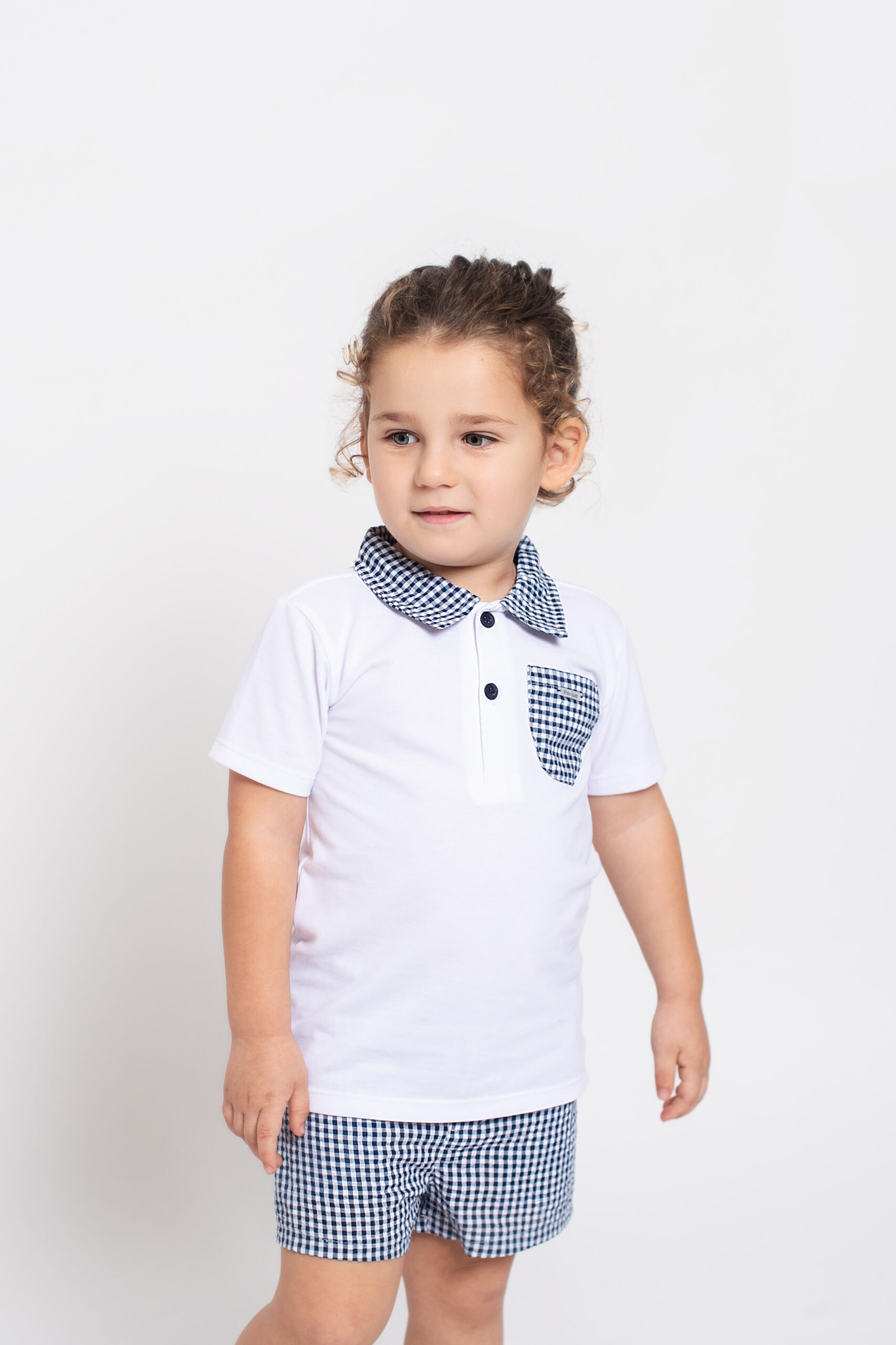 Conjunto para niño formado por camiseta tipo polo en color blanco, de manga corta, con cuello camisero con botones contrastados y detalle bolsillo en tejido cuadro vichy en color azul navy, a juego con el pantalón corto de cintura ajustable.