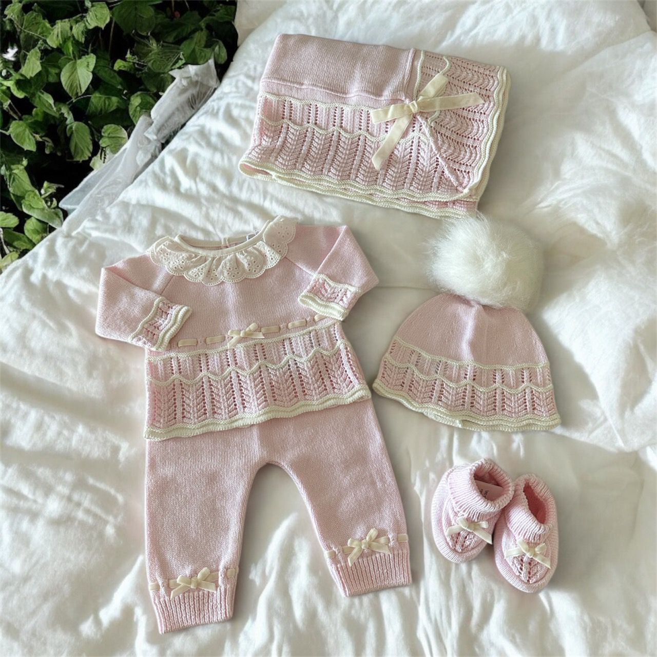 Manta + Conjunto 3P + Patucos Lazos Rosa Bebé