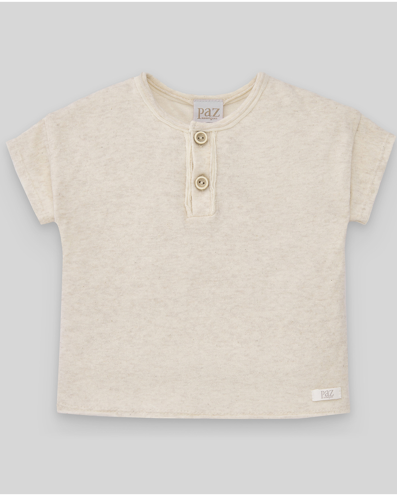 Camiseta de manga corta y cuello redondo estilo panadera. Botones en canesú.