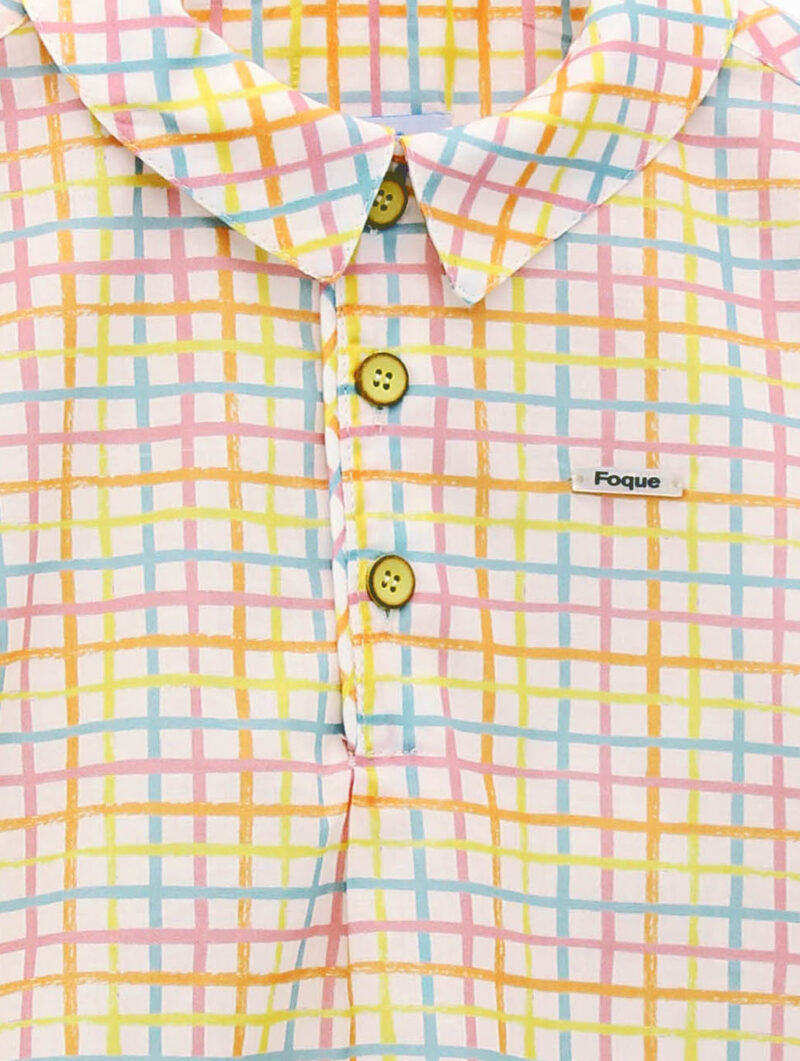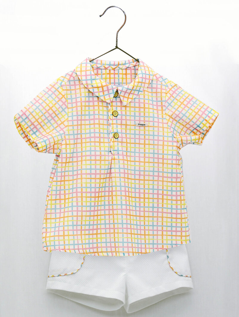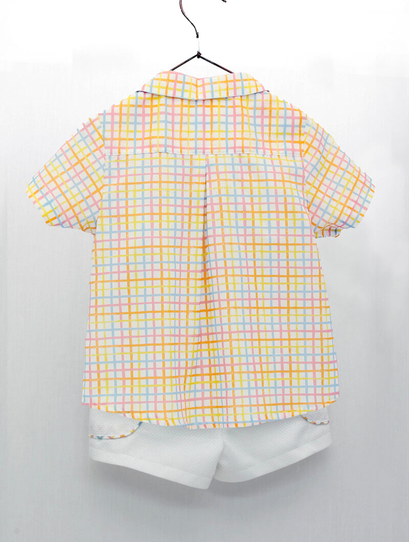 Camisa para bebé niño de manga corta, cuello camisero, en tejido cuadros multicolor y pantalón corto de piqué color blanco, con vivos a juego con la camisa. Completa el look con la sudadera 2415941. Confeccionado en España