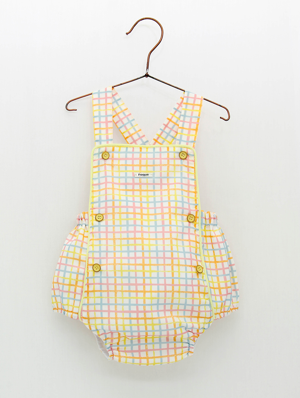 Ranita peto con tirantes para bebé niño confeccionado en tejido cuadro multicolor 100% algodón, botones en delantero para una mejor puesta. Colección Juliette.