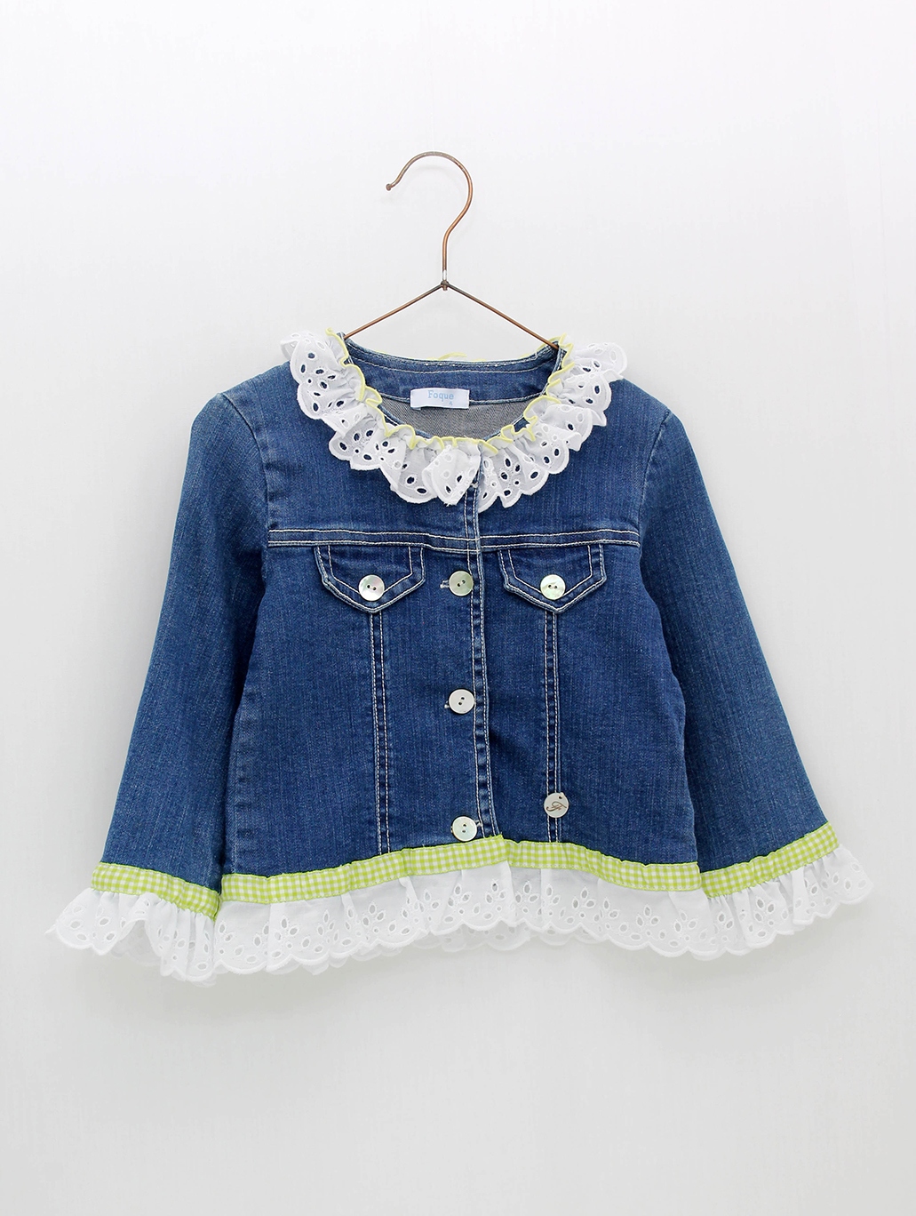 Cazadora vaquera niña con cuello puños y bajos de tira bordada blanca con detalles vichy color lima.