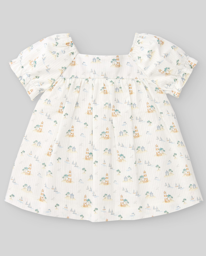 Vestido bebé niña estilo trapecio con estampado de motivos playeros y ligeras listas verticales. Mangas japonesas con remate de gomas que generan un ligero volante. Totalmente forrado, se cierra en la espalda con botones.