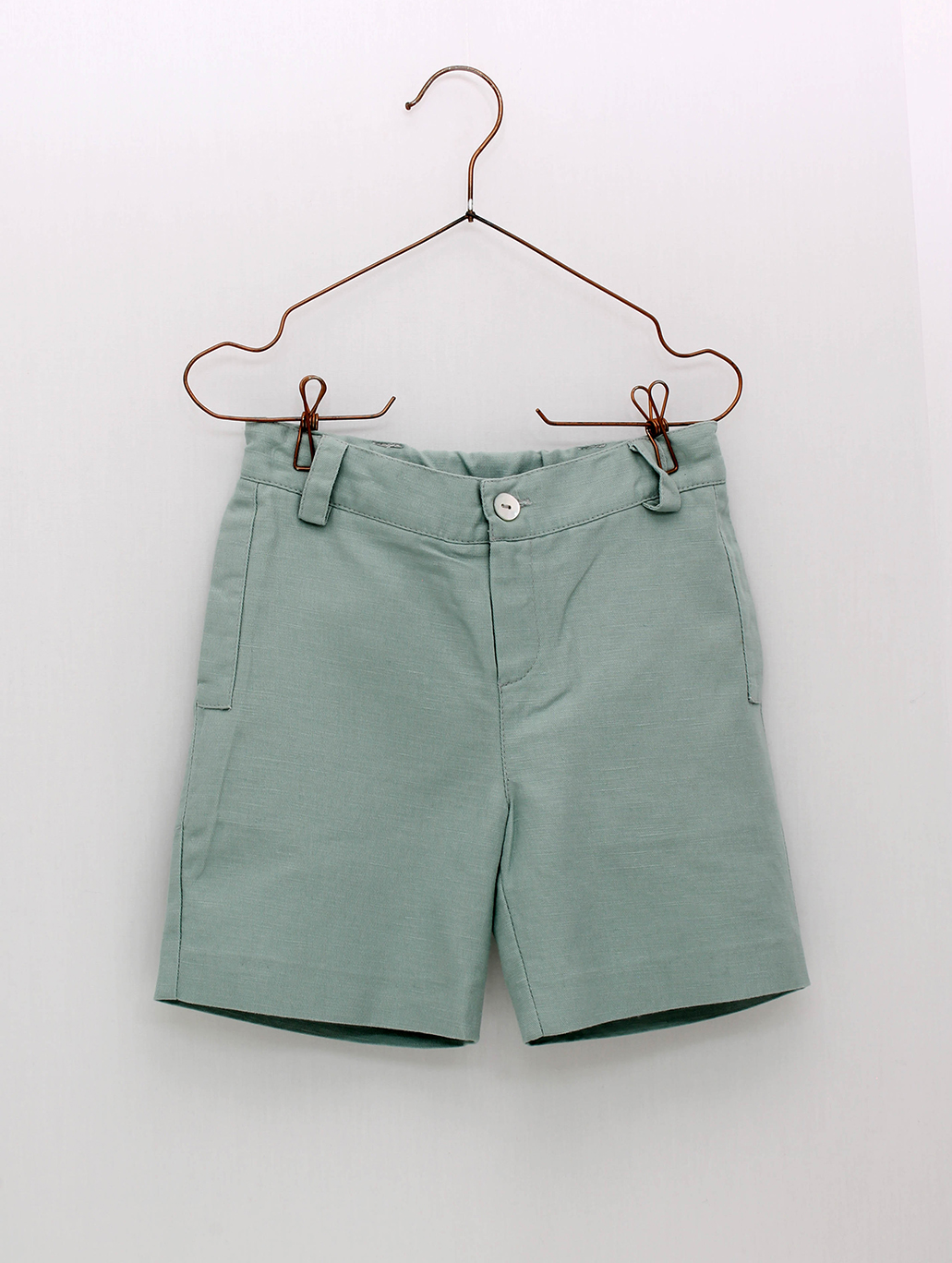 Pantalón corto para niño confeccionado en tejido mezcla de lino y algodón, con bolsillos a los lados, presillas para cinturón y cintura ajustable.