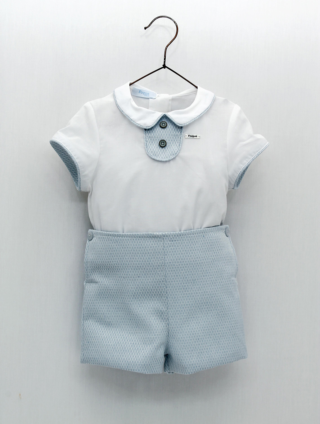 Conjunto niño formado por camisa blanca de manga corta y cuello bebé con vivos a contraste, pantalón corto de piqué en color azul celeste con cintura ajustable. Colección Ada. Hecho en España