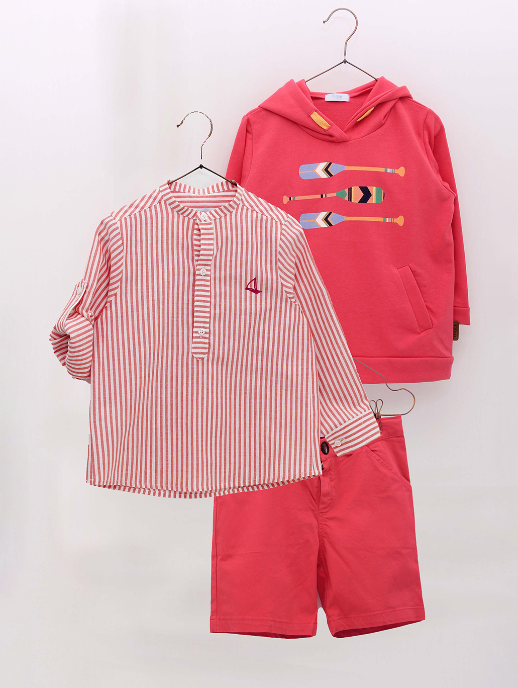 Camisa niño en tejido de rayas rojas con cuello mao con tapeta al bies, de manga larga con botón para remangarla.